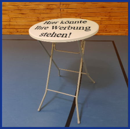Ebenfalls für die schwerpunktmäßig lokale Werbung eignet sich die Tischflächenbelegung eines oder mehrerer unserer brandneuen Bistrotische. Diese werden wie die Sponsorenwand bei Heimspielen, Turnieren und sonstigen Veranstaltungen aufgestellt und dienen Zuschauern als Imbisstisch. Auf kreisrunder Fläche von Ø 80cm bei 110cm Höhe lässt sich Ihr Logo und vielleicht noch ein Zusatz z.B. Ihrer Öffnungszeiten oder Kontaktdaten wunderbar darstellen. Die Aufsicht des Endverbrauchers aus noch nicht einmal 50 cm Distanz über eine lange Verweildauer am Tisch ermöglicht eine intensive Werbewirkung. Diese Werbeform eignet sich ideal für Ihr Unternehmen, wenn Sie über Ihr Firmenlogo hinaus noch Zusatzinformationen vermitteln möchten!