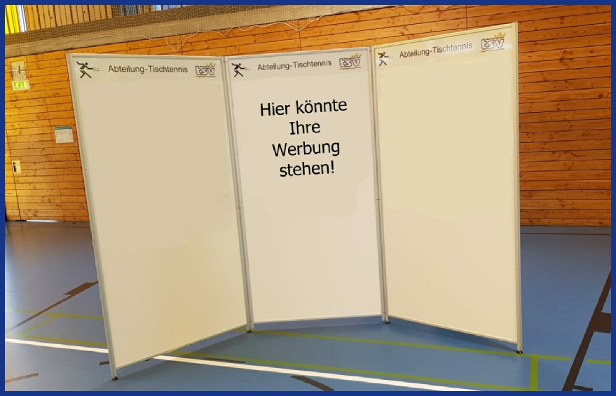 Sie setzen auf forcierte lokale Werbung und möchten den Endverbraucher vor Ort erreichen? Dann ist unsere Sponsorenwand genau das Richtige für Sie! Im DIN A3-Format platzieren wir darauf gern Ihr Logo und sichern Ihnen somit direkte Werbung bei Heimspielen, Turnieren und sonstigen Veranstaltungen unserer Abteilung. Die Sponsorenwand zieht die Aufmerksamkeit der Anwesenden durch Ihre Größe unmittelbar auf sich. So kann das Logo Ihres Unternehmens direkt an den Mann/die Frau gebracht werden. Ein sekundärer Werbeeffekt mit Reichweitenausdehnung stellt sich dadurch ein, dass Siegerfotos unserer Turniere vor der Sponsorenwand gemacht werden und Ihr Logo damit auch auf Fotos in Presseberichten erscheint. Die Anfertigung erfolgt auf weißem Papier, was nach Bedruckung laminiert wird und an der Wand fixiert wird.